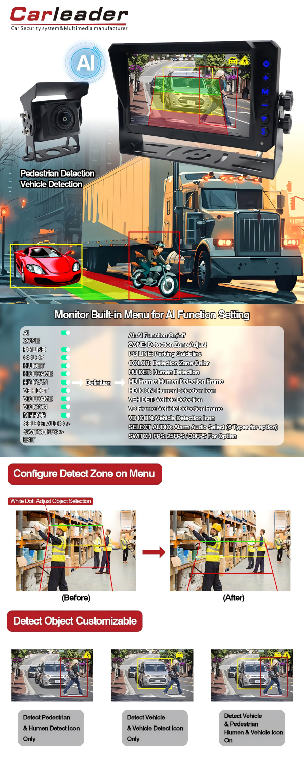 Carleader 7 tommer AI BSD Blind Spot Detection Monitoring System Support AI-kalibrering er designet med avancerede AI højpræcisionsalgoritmer og brugervenlig menu cz-betjening. Dette AI-kamerasystem giver chauffører al slags vejr, højpræcisions fodgænger- og køretøjsdynamiske advarsler, hvilket effektivt reducerer risikoen for trafikulykker. AI overvågningskamerasystem er velegnet til private biler, kommercielle flåder og specialkøretøjer. Flådens AI-system har stærk integration og kompatibilitet, holdbarhed og overvågningsmuligheder i realtid.
