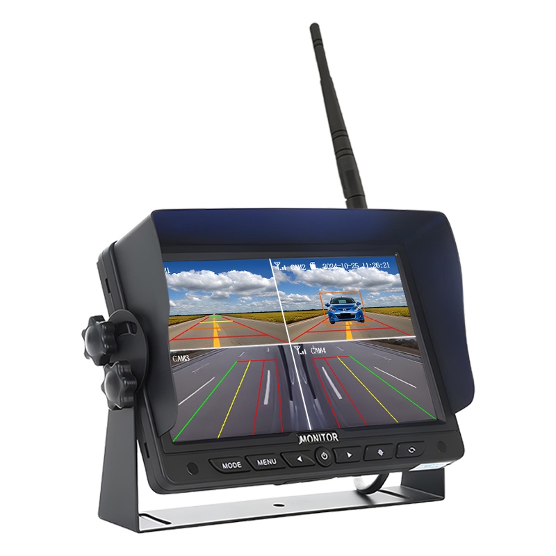Carleader 7 tommer BSD Blind Spot Detection Wireless Monitoring System, et digitalt trådløst kamerasystem integreret med AI-detektionsfunktion, understøtter fodgænger- og køretøjsdetektion og alarm, advarer føreren om køretøjets omgivende situation. Op til 4 kanaler 720P trådløse kameraer automatisk parring, hver kanal understøtter AI-detektionsfunktion. Overvåg den indbyggede AI-kalibreringsmenu for at justere størrelsen på detektionsområdet i henhold til den faktiske installationsposition og -vinkel. Skærm Understøtter valgfri funktion til loop-optagelse, understøtter op til 256 GB SD-kortlagring.