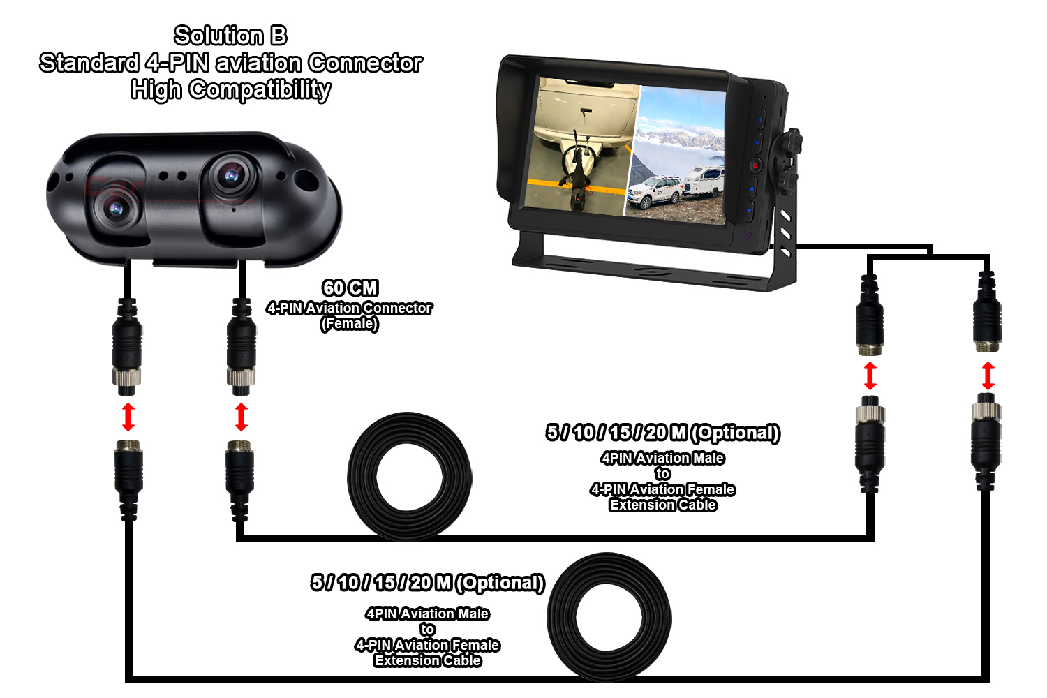 Carleader AHD Starlight dobbelt objektiv bakkamera passer til autocamper autocampere, et nyt designet AHD-kamera med privat værktøj i fremragende kvalitet, integreret med dobbelt linse i ét kamera, og linsevinklen kan justeres separat, hvilket giver brugeren mulighed for at se både nær- og fjernsyn på den samme skærm. Dette kamera passer ikke kun til tunge køretøjer, såsom lastbil, bus, gaffeltruck osv. også velegnet til autocampere, såsom autocampere og campingvogne.