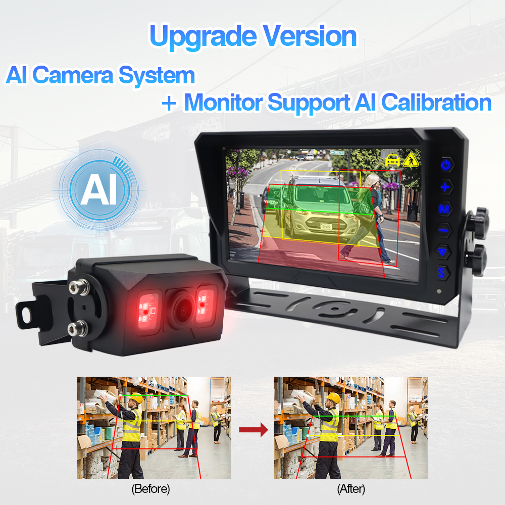 Carleader Nylanceret AI Blind Spot Detection Bakkamera Indbygget farveskiftende advarselslys, kamera med indbygget advarselslys og alarmfunktion, kan fungere med normal AHD-skærm. Hvis du har brug for AI-kalibreringsindstilling, foreslå at bruge med vores AI-monitor til at justere kameraets registreringszonestørrelse og anden AI-funktion.