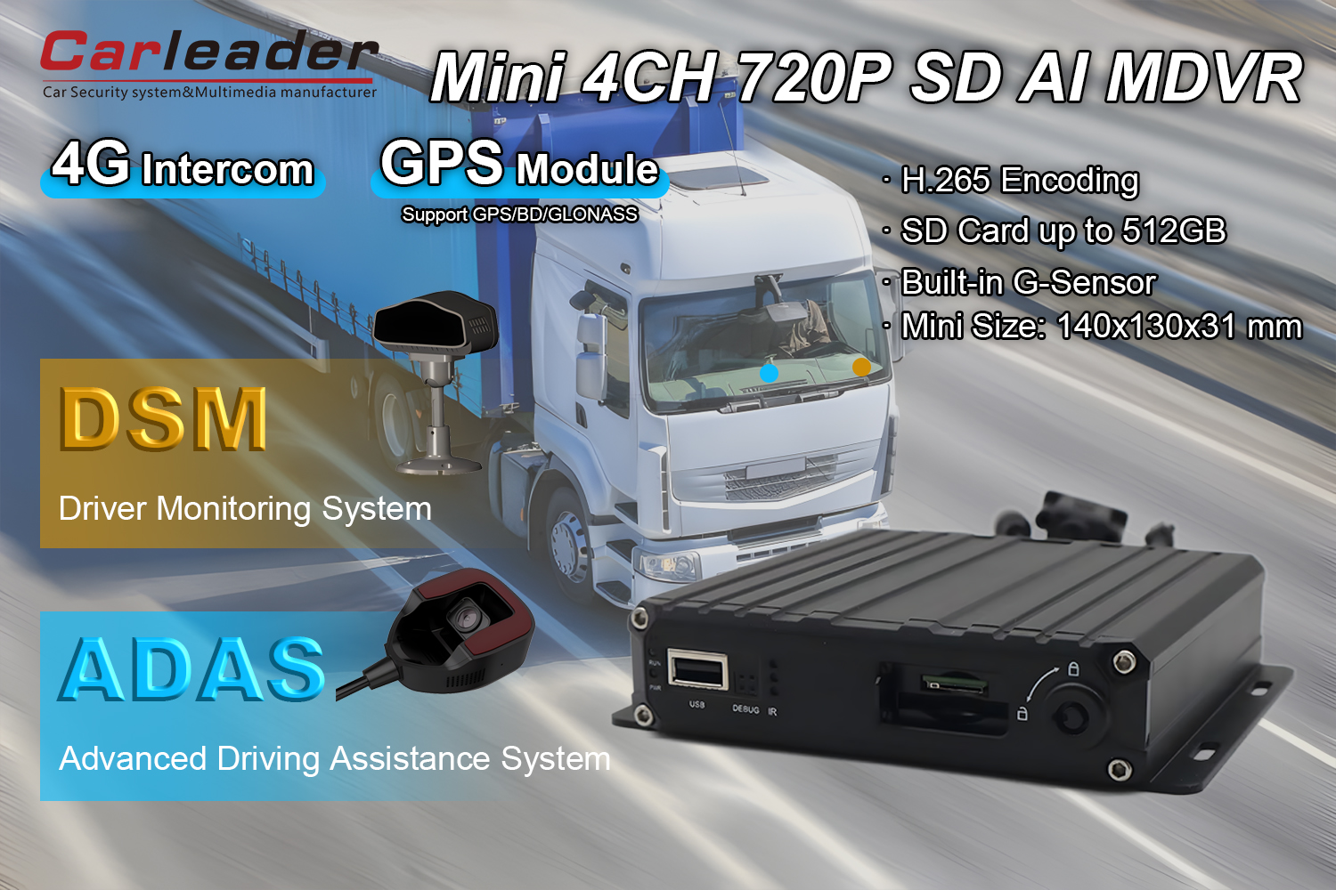 Leder4CH AI intelligent mobil DVR med DSM og ADAS kamera Ideel til brug i kommercielle flåder, offentlig transport, retshåndhævende køretøjer, sikkerhedssystemer til personlige og kommercielle køretøjer