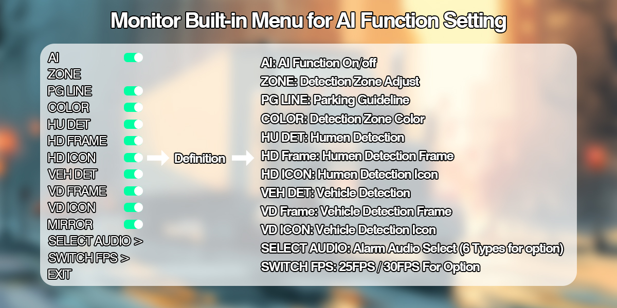 Leder7 tommer AI BSD Blind Spot Detection Monitoring System Support AI-kalibrering, en AI-kameraløsning, der understøtter registrering af fodgængere, registrering af køretøjer, øger sikkerheden markant under kørslen, monitor med indbygget AI-kalibreringsmenu, giver brugeren mulighed for at justere detektionsområdet, detektionszonefarvedisplay til/fra, alarmlydtype, køretøjs- og fodgængerikonvisning, valg af registreringsobjekt osv.