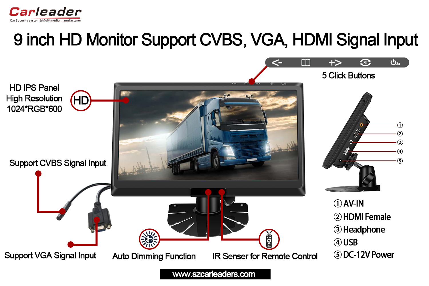 VoresLeder9 tommer IPS-skærm HD-skærm understøtter CVBS+HD+VGA-indgangehar den bedste videokvalitet og klarhed af alle vores køretøjsskærme, og har 5 specielle klikknapper øverst på skærmen, 9-tommers IPS-skærm Car Monitor Support CVBS,HD,VGA er i øjeblikket på lager og til salg.