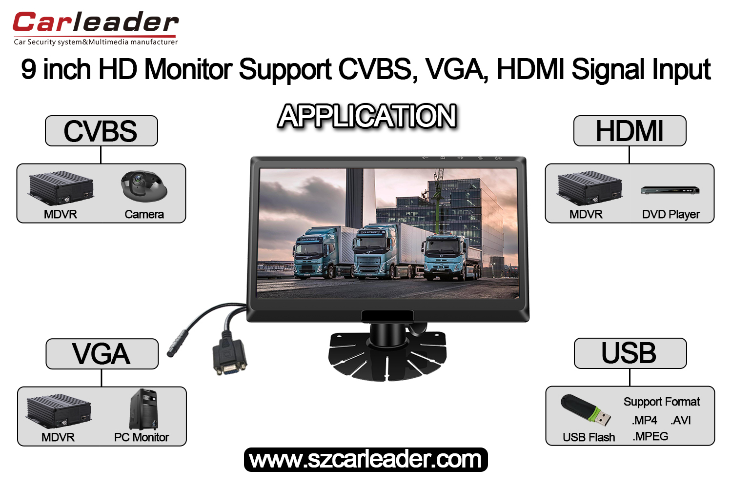 Leder9 tommer IPS-skærm HD-skærm understøtter CVBS+HD+VGA-indgangeer en højtydende HD-skærm designet til køretøjsovervågning og MDVR-flådestyring. Bilmonitoren understøtter CVBS-, HD- og VGA-signalindgange. Og hvis MDVR'en har VGA- eller HD-grænseflade, kan den bruges sammen med 9-tommers IPS-skærm i bil.