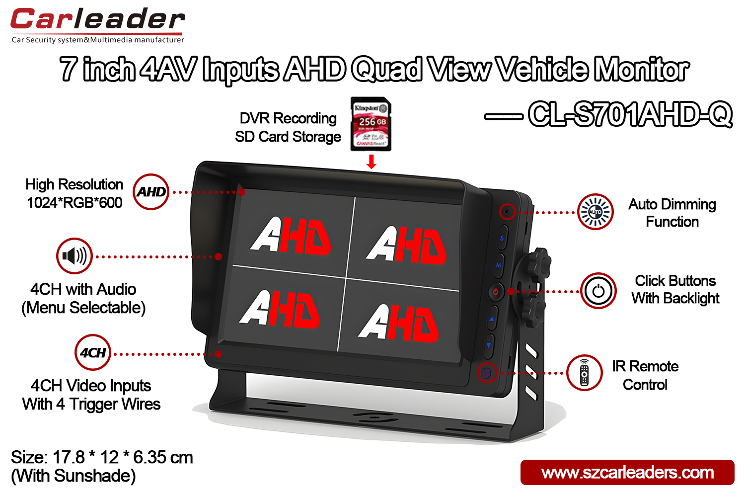 Carleader er stolte af at præsentere dig vores7 tommer 4CH AHD-indgange Quad View Display-skærm, quad view-design kan understøtte 4 kanaler til køretøjskamera, såsom Front View, Side View x2, Rear View, giver chauffører af store køretøjer (busser, lastbiler og varevogne) mulighed for at overvåge flere visninger af deres omgivelser, mens de betjener køretøjet.