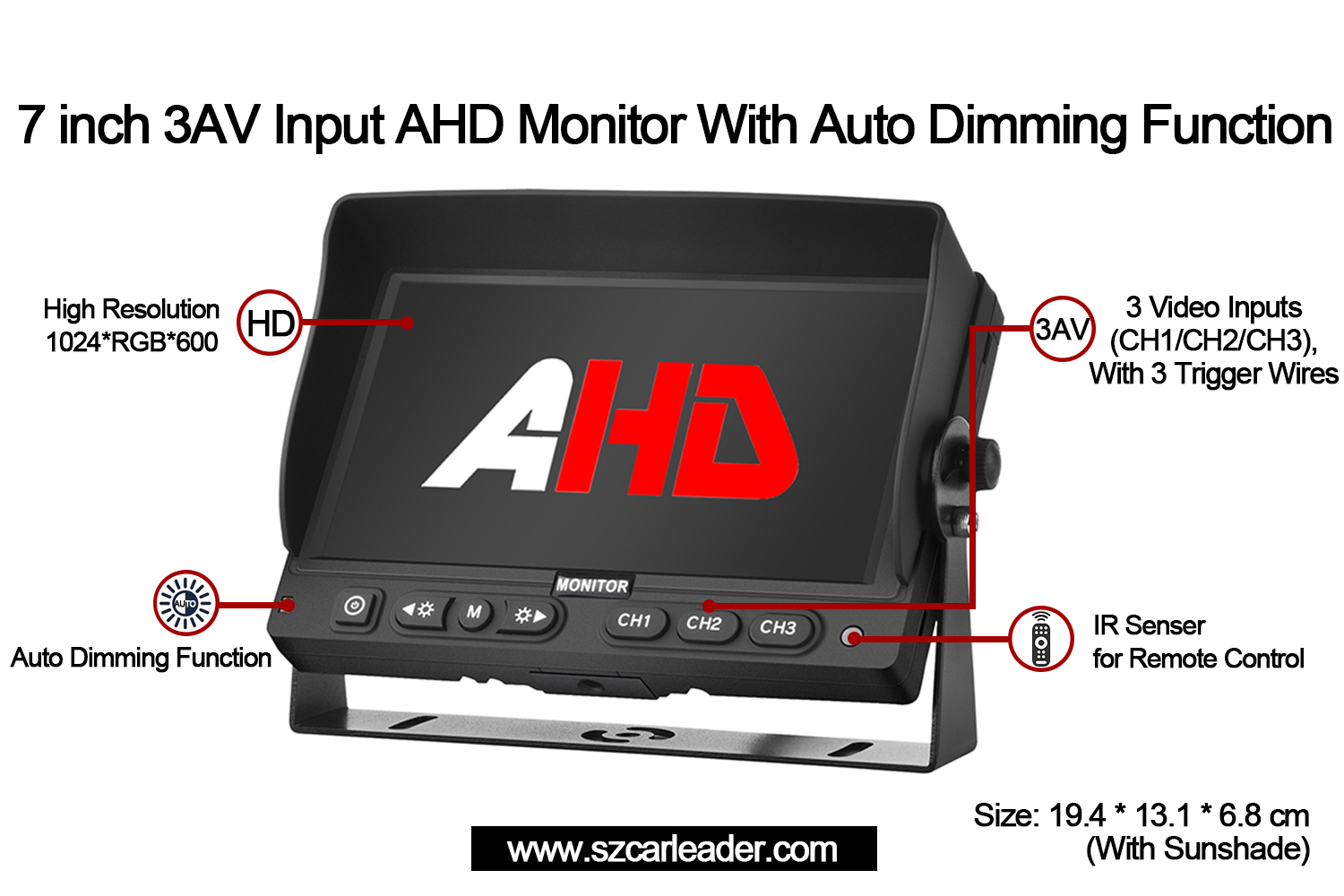 Perfekt til flådestyring, sikkerhedsovervågning eller industriel brug, Carleader7 tommer 3CH AHD-indgange Vehicle Backup Monitorkombinerer pålidelighed, alsidighed og brugercentreret innovation i en kompakt form.
