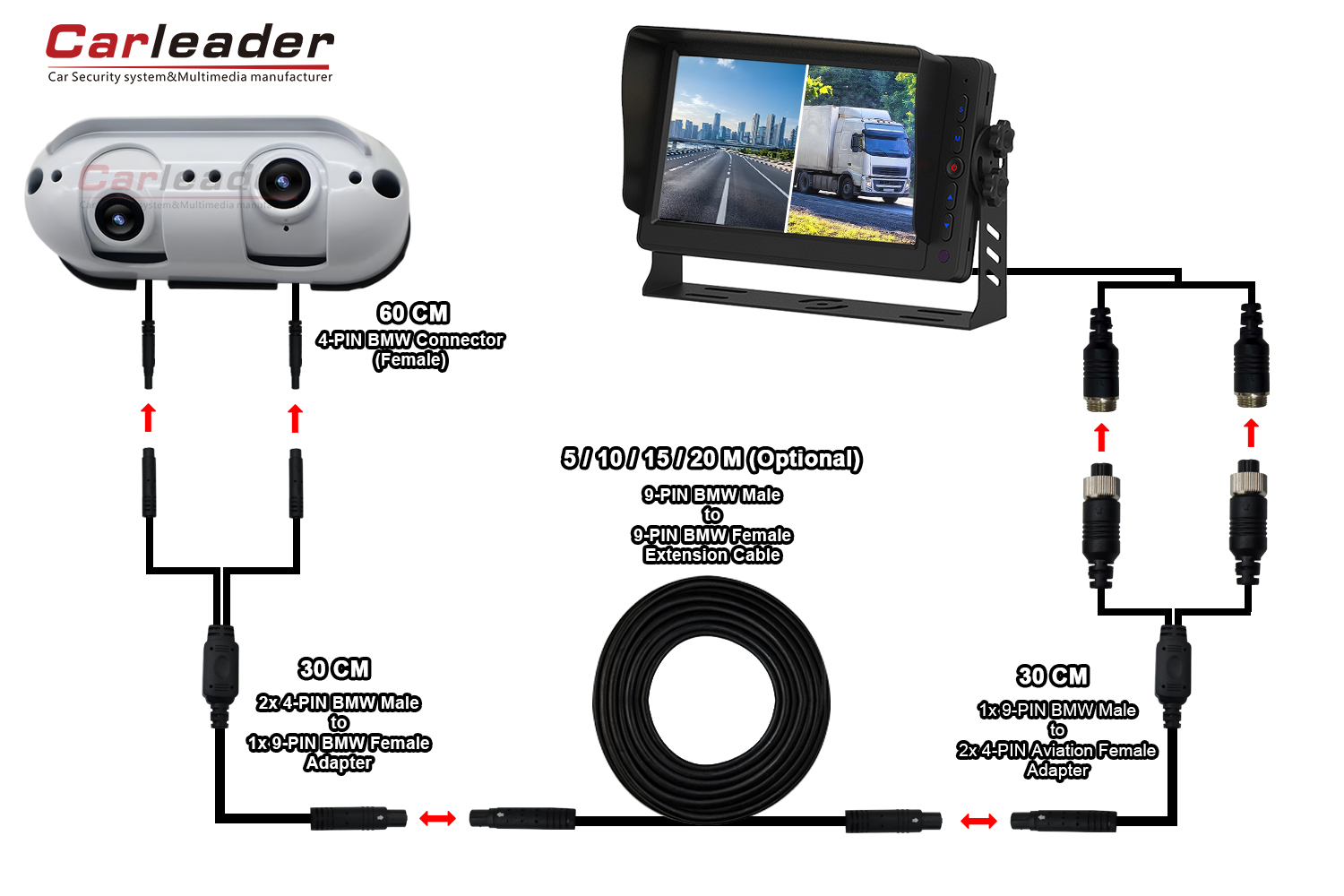 Den første løsning bruger kun et forlængerkabel (9-PIN BMW stik), 1 til 2 split kabel til begge ender for at forbinde kamera og skærm. Fordi denne løsning kun os på forlængerkabel, hvilket gør ledningsprocessen nemmere og mere bekvem.