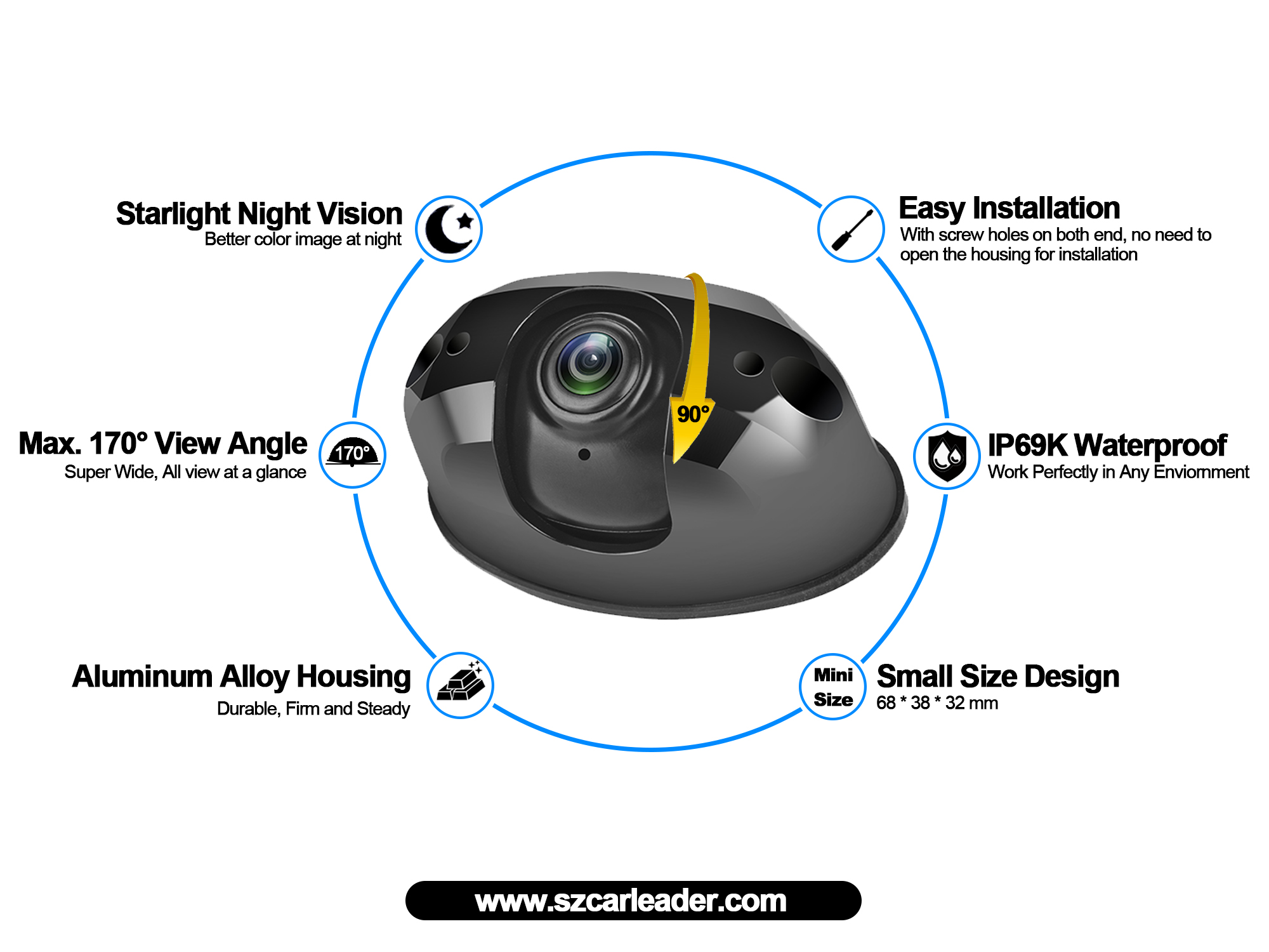 På køretøjsområdet, CarleaderAHD 170 graders vidsynsvinkel Vandtæt Heavy Duty Backup-kameraer meget udbredt i lastbiler, busser, skolebusser, RV-teknisk udstyr og andre tunge køretøjer. Det kan bruges som front-, side- og bakkamera og kan endda kombineres med MDVR for at opnå videooptagelse, fjernovervågning, flådestyring og andre funktioner
