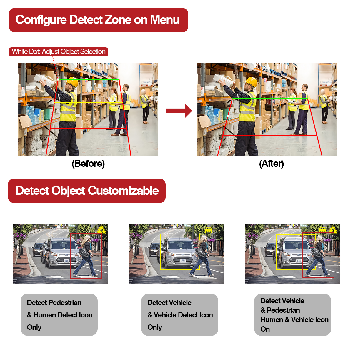 Dette AI-kamera med indbygget advarselslysfunktion, lysfarve skifter til tilsvarende farve, når detektionsobjekt kommer ind i et andet registreringsområde (rød, gul, grøn). Integreres også med alarm for at alarmere omkringliggende fodgængere og køretøjer, der kommer tæt på dit køretøj.