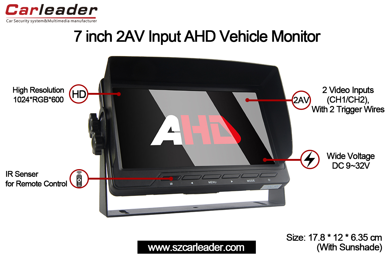 Leder7 tommer AHD 2CH Input køretøjsskærmer en bil AHD-skærm designet til at levere klar, pålidelig videovisning til kommercielle og private køretøjsapplikationer. Denne skærm er bygget med et digitalt panel af høj kvalitet og understøtter avancerede AHD-videoindgange og sikrer fremragende synlighed og brugervenlighed under forskellige kørselsforhold.