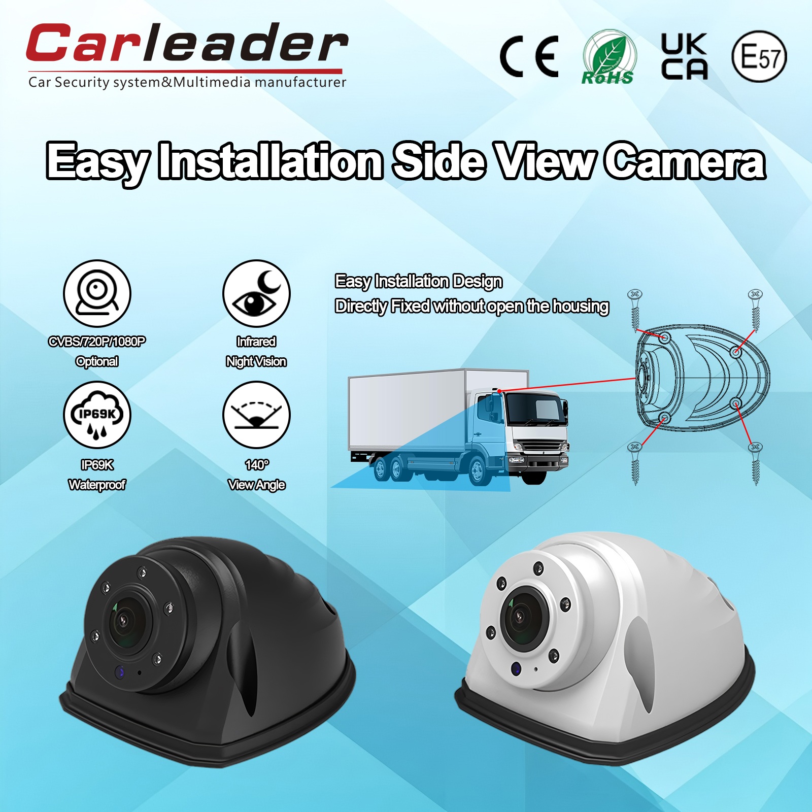 Nem installationsdesign: Nem installation Heavy Duty Vehicle Side View-kamera designet med 4 nemme installationshuller på huset, som giver brugeren mulighed for at fastgøre kameraet uden at åbne kabinettet, nem installation og tidsbesparende.